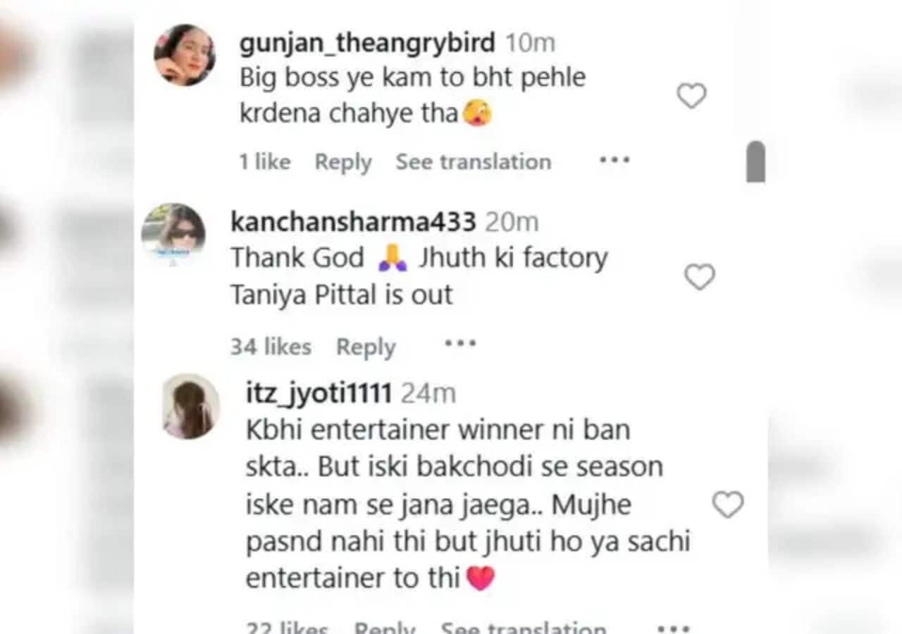जैसे-जैसे विनर की घोषणा का वक्त नजदीक आ रहा है, वैसे-वैसे कंटेस्टेंट्स के साथ-साथ करोड़ों दर्शकों की धड़कनें भी तेज ही रही हैं. वहीं टॉप 5 से टॉप 3 कंटेस्टेंट की रेस में सबसे पहले तान्या मित्तल घर से बेघर हो गई. ग्रैंड फिनाले की रेस से सबसे पहले बाहर होने वाले कंटेस्टेंट कोई और नहीं तान्या मित्तल हैं और इसी के साथ उनका विनर बनने का सपना भी टूट गया, लेकिन जैसे ही यह खबर बाहर आई, वैसे ही कुछ लोग इससे काफी खुश नजर आए और तान्या के एविक्शन पर उन्होंने जो रिएक्शन दिए अब वो वायरल हो रहे हैं.