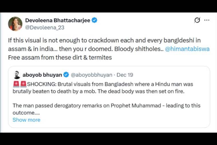 वहीं इस निंदनीय घटना पर टीवी एक्ट्रेस देवोलीना भट्टाचार्जी (Devoleena Bhattacharjee) ने भी इस पर रिएक्टर किया है. उन्होंने कहा, 'अगर यह घटना असम और भारत में हर बांग्लादेशी के खिलाफ कार्रवाई करने के लिए काफी नहीं है तो... आप बर्बाद हो चुके हैं.