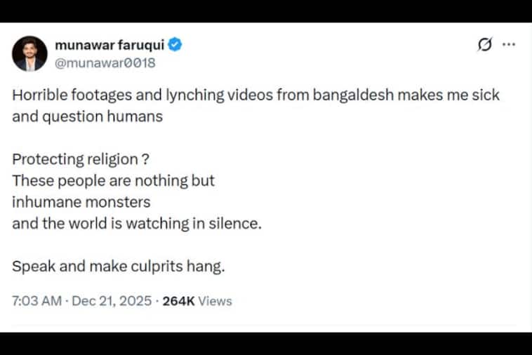 बांग्लादेश में हिंदू व्यक्ति की हत्या मामले में स्टैंड-अप कॉमेडियन मुनव्वर फारूकी (Munawar Faruqui) का बयान सामने आया है, जिसमें उन्होंने दोषियों को 'फांसी' की मांग करते हुए अपना गुस्सा और दुख व्यक्त किया है. मुनव्वर फारूकी ने एक्स पर एक पोस्ट शेयर किया है, जिसमें उन्होंने लिखा, 'बांग्लादेश से आ रहे भयानक फुटेज और लिंचिंग के वीडियो देखकर मेरा मन दुखी हो जाता है और मैं इंसानियत पर सवाल उठाने लगता हूं. धर्म की रक्षा?'