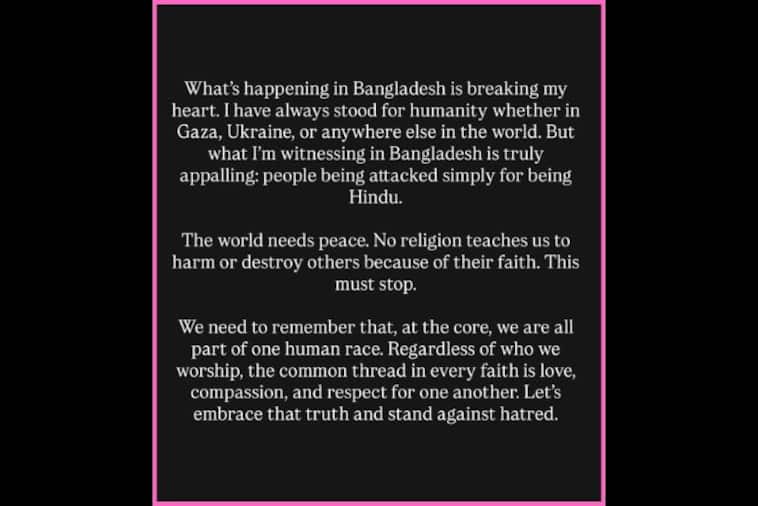 उन्होंने आगे कहा, 'लेकिन बांग्लादेश में मैं जो देख रहा हूं, वह सचमुच भयावह है. लोगों पर सिर्फ हिंदू होने के कारण हमला किया जा रहा है. दुनिया को शांति की जरूरत है, कोई भी धर्म हमें दूसरों को उनके धर्म के कारण नुकसान पहुंचाने या नष्ट करने की शिक्षा नहीं देता. यह सब बंद होना चाहिए.'