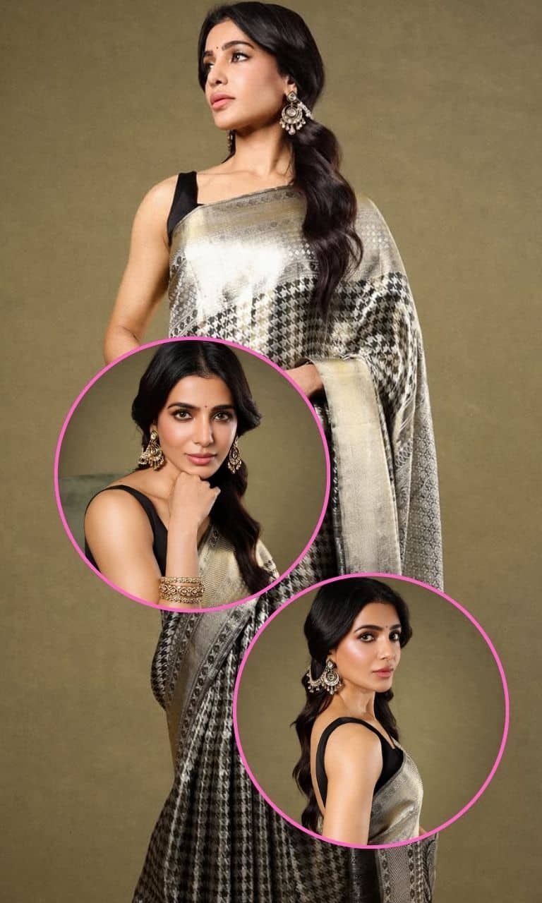 स्लीवलेस ब्लाउज के साथ सामंथा ब्लैक और गोल्डन साड़ी पहने नजर आ रही हैं.