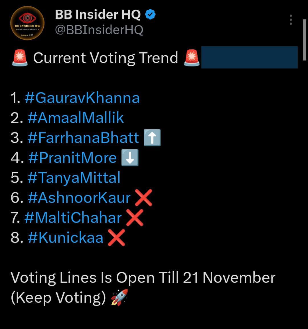 Gaurav Khanna is the one who stands out the most, according to social media's viral voting trends. His tacticalness and quiet yet successful approach to the game are gaining admiration. Farhana Bhat, Amaal Malik, and Ashnoor Kaur, all of them, are very firmly behind him. Praneet More and Tanya Mittal have had a mixed performance, and the entire scenario can be turned upside down with just a tiny shift in votes before the Weekend Ka Vaar.