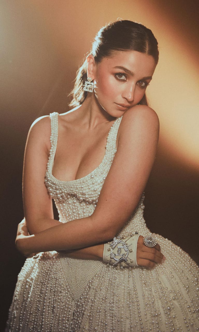 In a very shimmery, glowy and almost champagne-colored gown, Alia’s saree-dress combo just speaks red carpet-vibes.