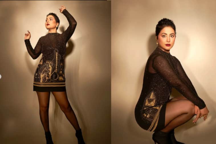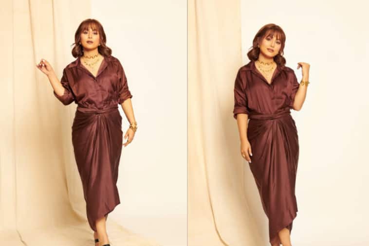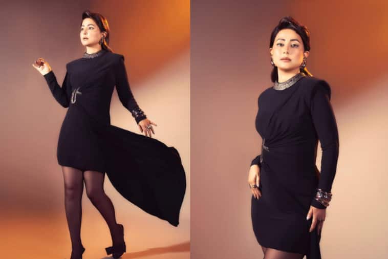 Hina Khan looks stylish in a cool-toned denim co-ord, which turns every head. The cropped top and fitted skirt have very textured detailing, which gives a modern chic vibe to the outfit. Paired with statement heels and soft glam makeup, this look can be your perfect one for entering 2026 with style.