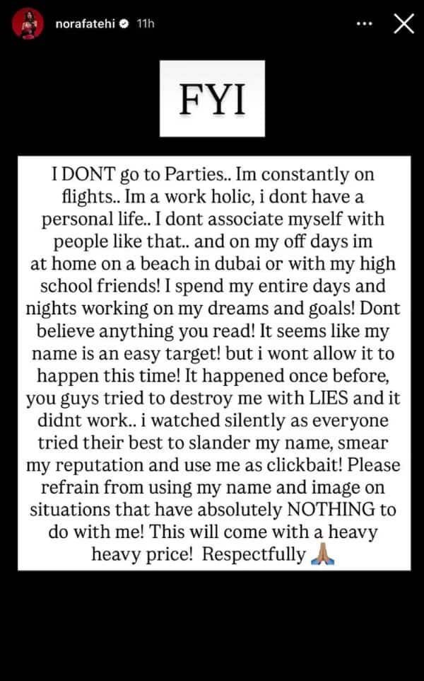 Bollywood actress Nora Fatehi has responded strongly to rumours that she is associated with a drug gang that is purportedly linked to underworld don Dawood Ibrahim. The actress used Instagram to refute the allegations, calling them "baseless" and "clickbait," only two days after her name allegedly appeared in the Mumbai Police's inquiry. With a prominent "FYI (For Your Information)" title at the top of her Instagram story, Nora- best known for her popular song Saki-Saki- made an important statement.