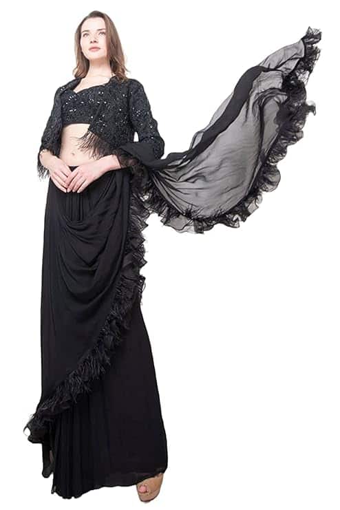 - Ready-to-wear Frill Ruffle Sari, designed to fit up to a 40-inch waist effortlessly.