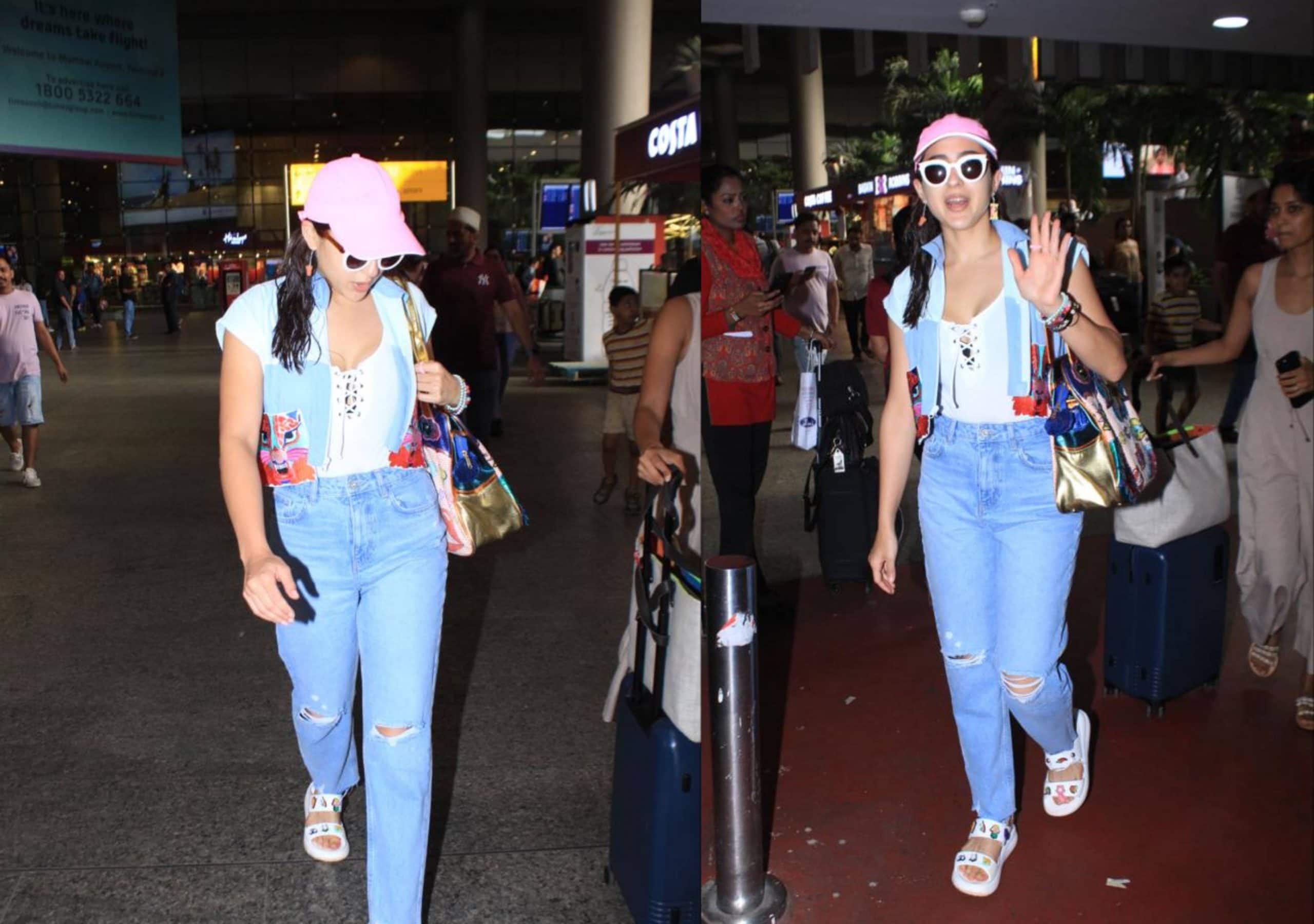 The Kedarnath diva churned out many looks this week. From walking the ramp in a designer lehenga to comfortable airport looks, she got papped often. But her latest airport look gets a thumbs down. She went for an aww-too-cute look in blue denim, white top and a cropped jacket. She added a pink cap and white glasses along. The whole look appeared childish.