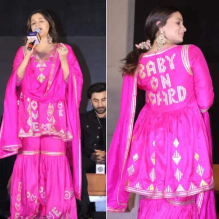 Alia Bhatt wore this sharara from Gulabo by Abu Jani and Sandeep Khosla for the Brahmastra event in Hyderabad. The actress' look did not impress netizens at all. They feel Alia Bhatt is bad at the maternity fashion game. Morever, the baby statement on the dress came across as cringe as per many.