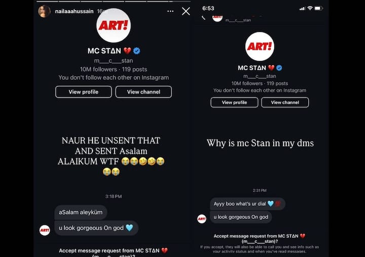 Another influencer named Naila Hussain had made a similar claim against MC Stan. She shared a screenshot of a message by rapper 'Asalam aleykum u look gorgeous Oh god.
