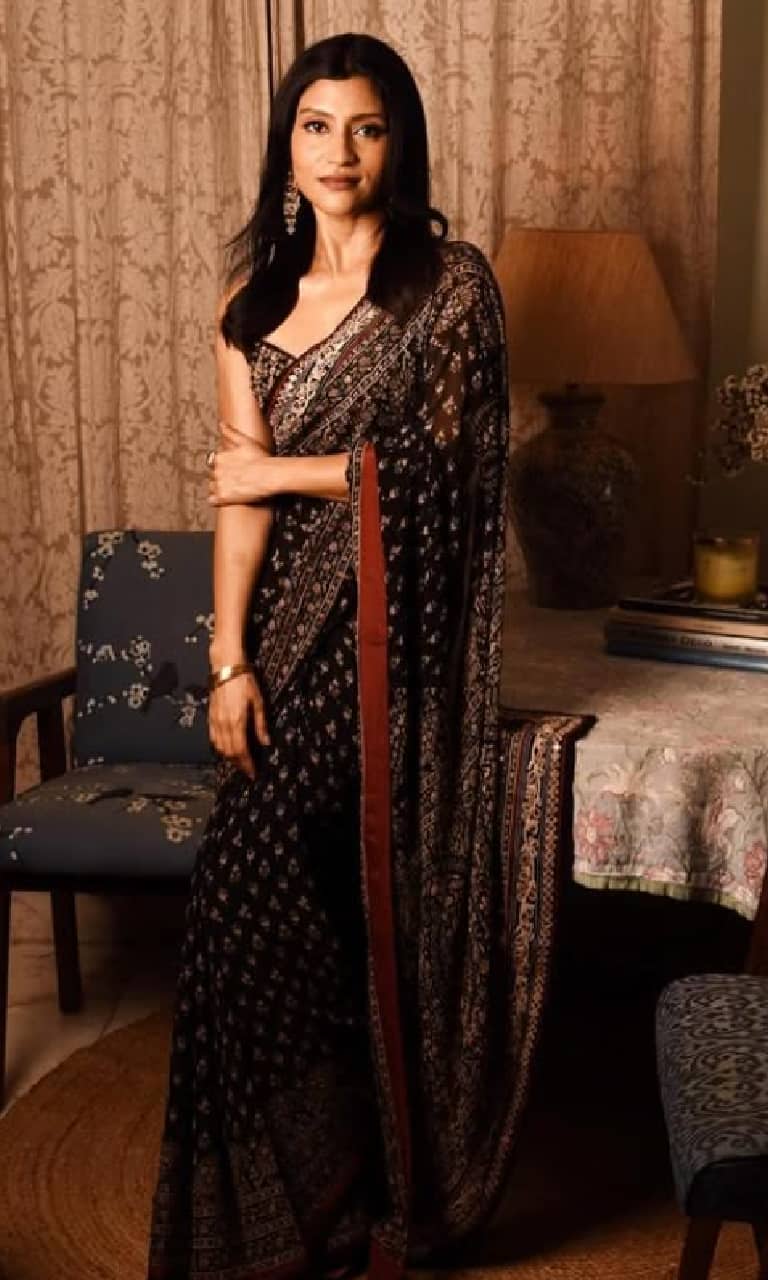Simple dark saree paired with a vibrant blouse gives traditional appeal.