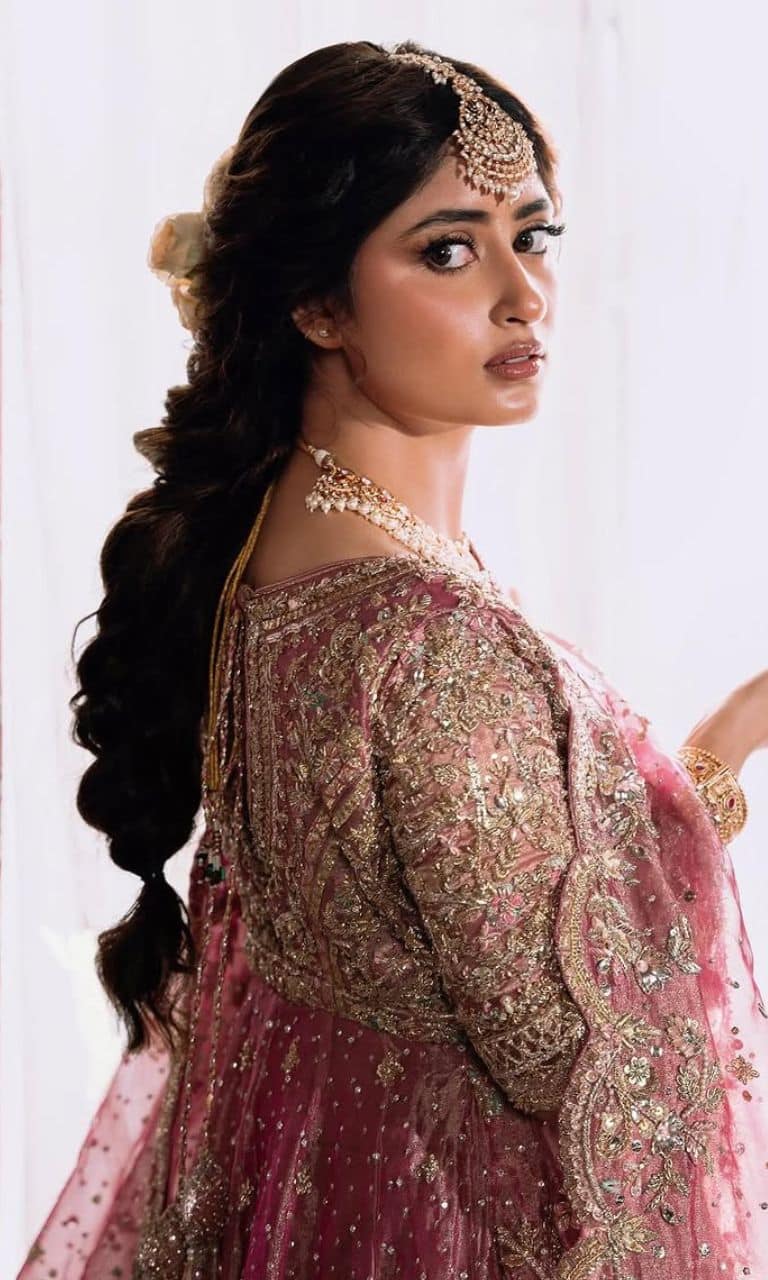 Sajal makes heads turn in this unique heavy plated hairstyle complemented with a flower.