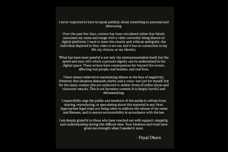 'मैं आम लोगों और मीडिया के लोगों से रिक्वेस्ट करती हूं कि वे इस मटीरियल को किसी भी तरह से शेयर, दोबारा बनाने या इसके बारे में अंदाजा लगाने से बचें. मेरे नाम और मेरी तस्वीर के गलत इस्तेमाल को रोकने और कानून के हिसाब से जवाबदेही पक्का करने के लिए सही कानूनी कदम उठाए जा रहे हैं. मैं उन लोगों की बहुत शुक्रगुजार हूं जिन्होंने इस मुश्किल समय में सपोर्ट, हमदर्दी और समझदारी दिखाई. आपकी मेहरबानी और भरोसे ने मुझे उस समय हिम्मत दी जब मुझे इसकी सबसे ज्यादा जरूरत थी.