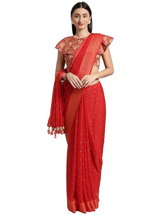 - Color Harmony: Red saree with a matching red blouse for a coordinated look.