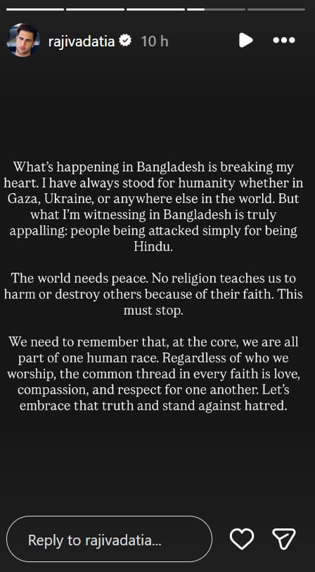 Rajiv Adatia issued a statement on this matter, which reads, "What’s happening in Bangladesh is breaking my heart. I have always stood for humanity whether in Gaza, Ukraine, or anywhere else in the world. But what I’m witnessing in Bangladesh is truly appalling: people being attacked simply for being Hindu. The world needs peace. No religion teaches us to harm or destroy others because of their faith. This must stop.”
